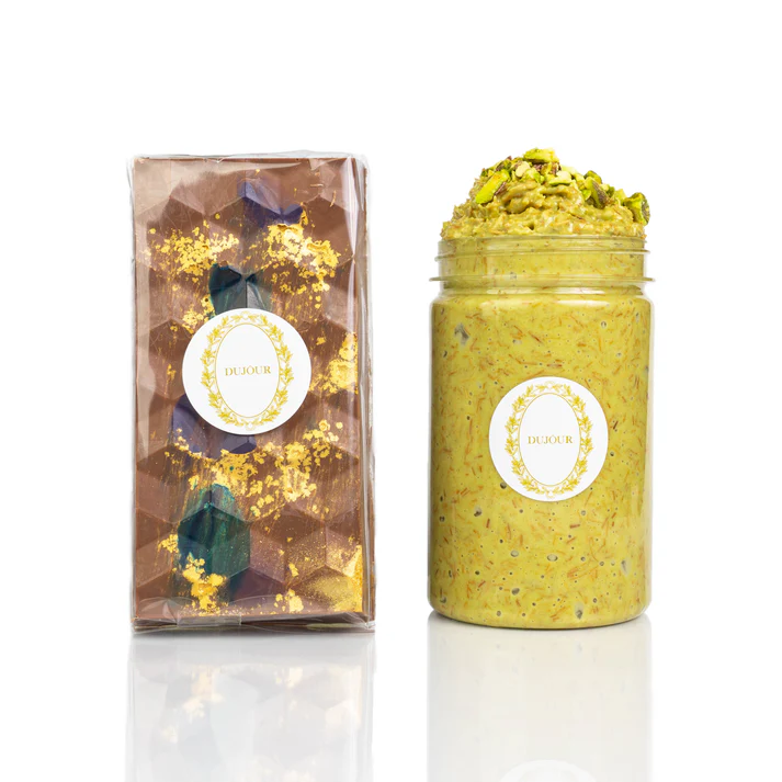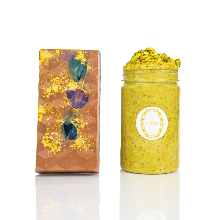 Indulge in the ultimate dessert experience with our Pistachio Knafeh Chocolate Bar & Crunchy Spread Bundle, inspired by the rich, iconic flavors of Dubai. This luxurious set combines silky milk chocolate with a crunchy, nutty pistachio spread to give you a sweet moment you’ll want to relive again and again.