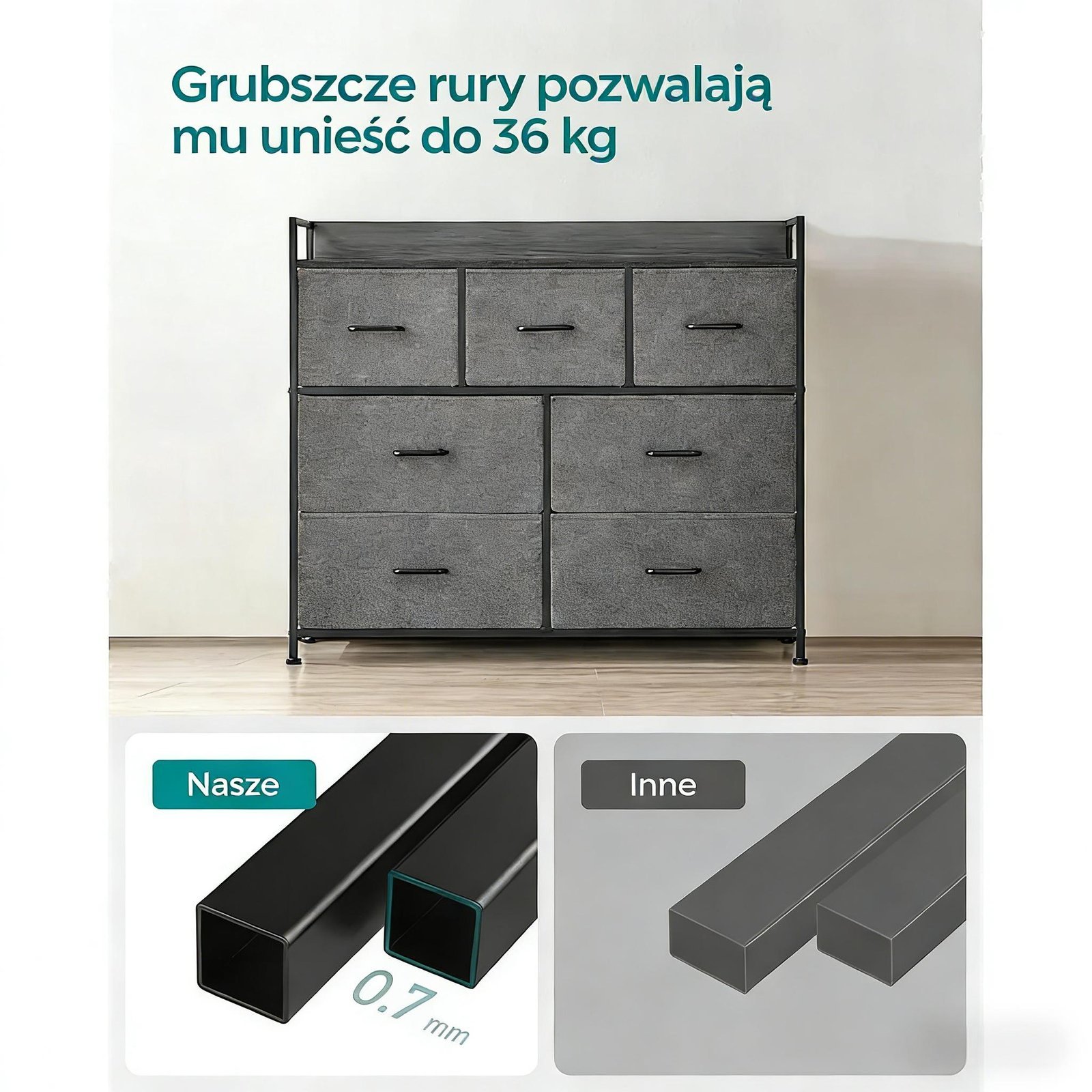When the fabric sides of the drawer meet the MDF board on its front and bottom, and when the MDF tabletop and back panels meet the metal frame—wham! A stable and sturdy chest of drawers appears, which can also be conveniently lifted and moved.